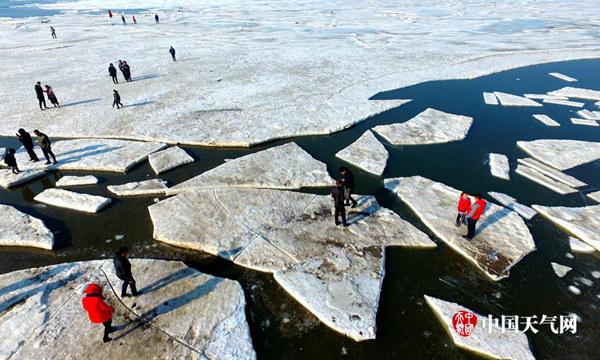 遼寧大連氣溫連續回升,海冰融化,游人冒險踏冰。(圖/呂文正)