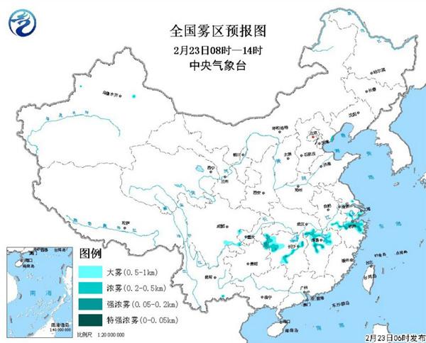 中央氣象臺今天6時繼續發布大霧黃色預警,預計今天早晨至上午,安徽南部、江蘇南部、浙江北部、江西北部、湖北東南部、湖南西北部和中部、四川盆地南部等地有大霧天氣,其中浙江北部、江西北部、湖南西北部和中部等地的部分地區有濃霧,局地能見度低于200米。