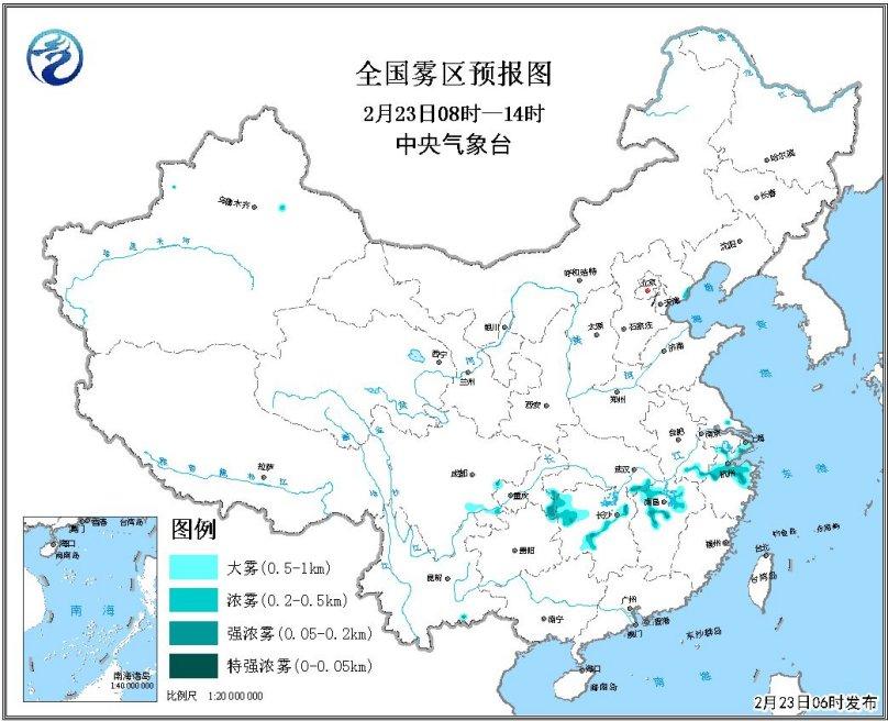 23日早晨至上午,安徽南部、江蘇南部、浙江北部、江西北部、湖北東南部、湖南西北部和中部、四川盆地南部等地有大霧天氣,其中浙江北部、江西北部、湖南西北部和中部等地的部分地區有濃霧,局地能見度低于200米。中央氣象臺2月23日06時繼續發布大霧黃色預警。