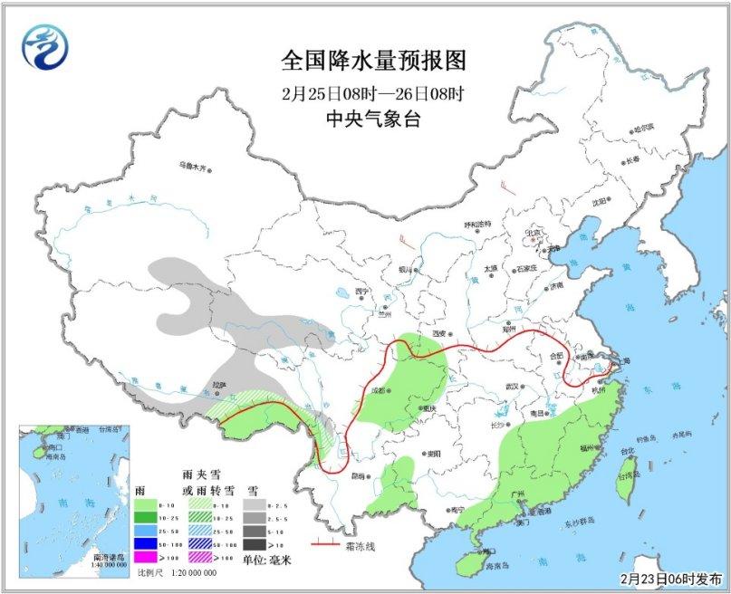 24日08時至25日08時,北疆北部、南疆西部、西藏西南部、川西高原、山東北部等地有小雪或雨夾雪,其中西藏西南部局地有中到大雪;江漢南部、江淮南部、江南、華南、西南地區東部、云南北部和東部、四川南部、臺灣等地有小到中雨或陣雨。內蒙古中西部、遼東半島、山東半島等地有4~6級風。
