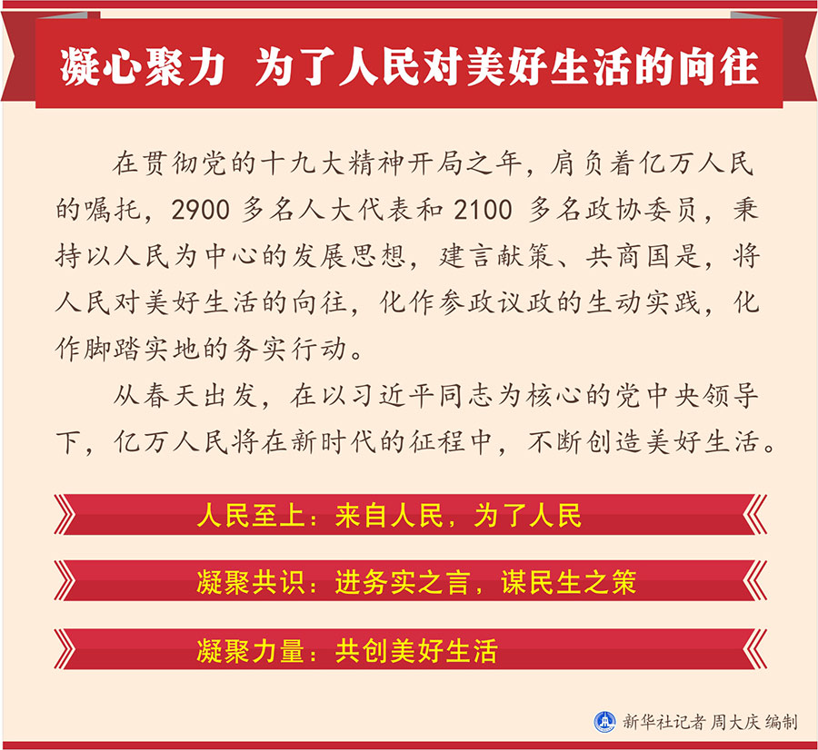 在貫徹黨的十九大精神開局之年,肩負(fù)著億萬人民的囑托,2900多名人大代表和2100多名政協(xié)委員,秉持以人民為中心的發(fā)展思想,建言獻(xiàn)策、共商國是,將人民對(duì)美好生活的向往,化作參政議政的生動(dòng)實(shí)踐,化作腳踏實(shí)地的務(wù)實(shí)行動(dòng)。