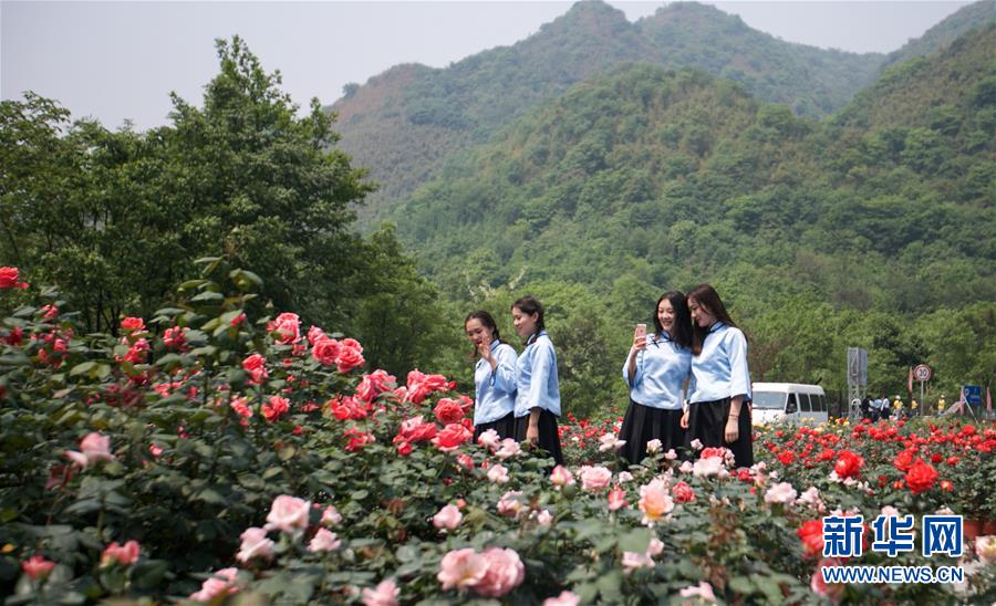 來自成都的大學生在位于四川綿竹市的“中國玫瑰谷”游覽拍照(4月18日攝)。新華社記者 張帆 攝