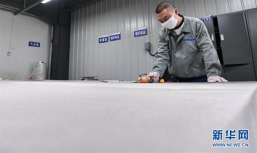 在四川北川天訊新材料有限公司,工作人員對導電布測電阻(3月9日攝)。 新華社記者 薛玉斌 攝