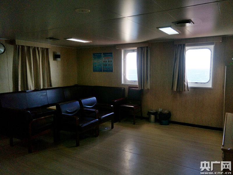 餐廳對面是船員休息區,裝有衛星電視。以前出海就相當于與外界隔絕。而現在,打開船上的電視,每天都能看到十幾個頻道的電視節目。茫茫大海上,雖遠離陸地,卻時時刻刻都可以看到國內最新動態,信息無盲區。