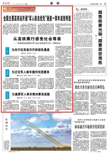 去年8月1日,中國鐵路總公司、軍委后勤保障部聯(lián)合決定,在全國鐵路系統(tǒng)開展軍人出行依法優(yōu)先工作。這項(xiàng)政策實(shí)施一年來成效如何?記者走進(jìn)高鐵站進(jìn)行了采訪調(diào)查,實(shí)地探訪“軍人依法優(yōu)先”給官兵出行帶來的新變化。請關(guān)注今天出版的《解放軍報》的報道——