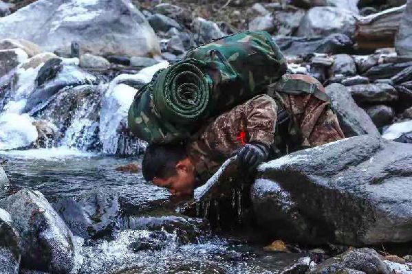 2018年1月10日,西藏一條邊防線上,一名巡邏戰士俯下身來喝冰水。圖片來源:中國青年報