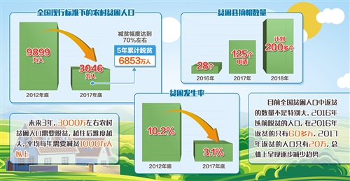在以習(xí)近平同志為核心的黨中央堅(jiān)強(qiáng)領(lǐng)導(dǎo)下,脫貧攻堅(jiān)力度之大、規(guī)模之廣、影響之深前所未有。經(jīng)過(guò)幾年的努力,脫貧攻堅(jiān)取得決定性進(jìn)展:全國(guó)現(xiàn)行標(biāo)準(zhǔn)下的農(nóng)村貧困人口由2012年底的9899萬(wàn)人,減少到2017年底的3046萬(wàn)人,5年累計(jì)脫貧6853萬(wàn)人,減貧幅度達(dá)到70%左右。貧困發(fā)生率由2012年底的10.2%下降到2017年底的3.1%。貧困縣數(shù)量實(shí)現(xiàn)了首次減少,2016年有28個(gè)貧困縣脫貧摘帽,2017年有125個(gè)貧困縣申請(qǐng)摘帽,今年計(jì)劃200多個(gè)縣摘帽,解決區(qū)域性整體貧困邁出堅(jiān)實(shí)步伐。貧困地區(qū)群眾生產(chǎn)生活條件明顯改善,貧困群眾收入水平明顯提高、獲得感明顯增強(qiáng)。