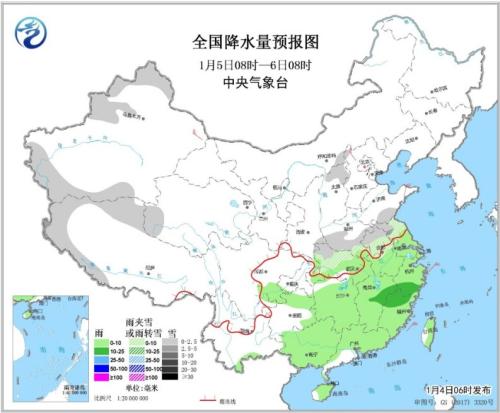 1月5日08時(shí)至6日08時(shí),新疆北部和南疆盆地、西藏西部和北部、青海西部、山西北部、黃淮中南部、江淮北部、江漢中北部等地的部分地區(qū)有小雪或雨夾雪,局地中雪;四川盆地南部、江漢南部、江淮南部、江南、華南大部和臺(tái)灣島等地的部分地區(qū)有小到中雨。新疆東部和山東半島等地的部分地區(qū)有4~6級(jí)及以上風(fēng)(見圖2)。