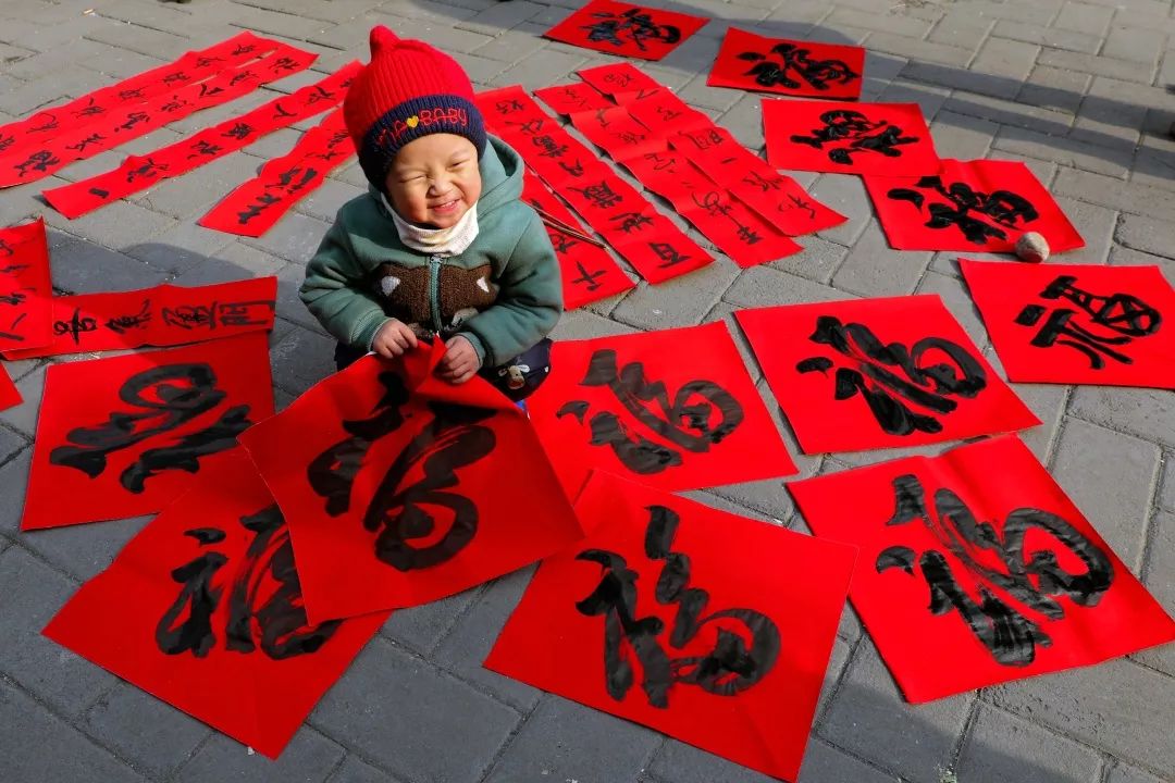 2019-1-28,河北涉縣更樂鎮(zhèn)。新春到來之際,書協(xié)的朋友們在大廟里揮毫潑墨寫春聯(lián)送鄉(xiāng)親,村娃跑來湊熱鬧,蹲在福字里陶醉,幸福又快樂。作者:滄海