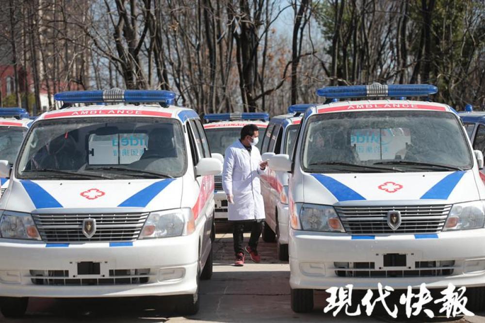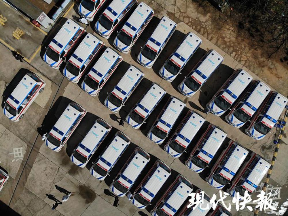 2月16日上午11點(diǎn)半,13輛大型平板車(chē)載著40輛負(fù)壓救護(hù)車(chē),運(yùn)抵武漢蔡甸區(qū)中石化南崗加油站,統(tǒng)一派發(fā)湖北省內(nèi)38個(gè)定點(diǎn)醫(yī)療單位在救援時(shí)使用。