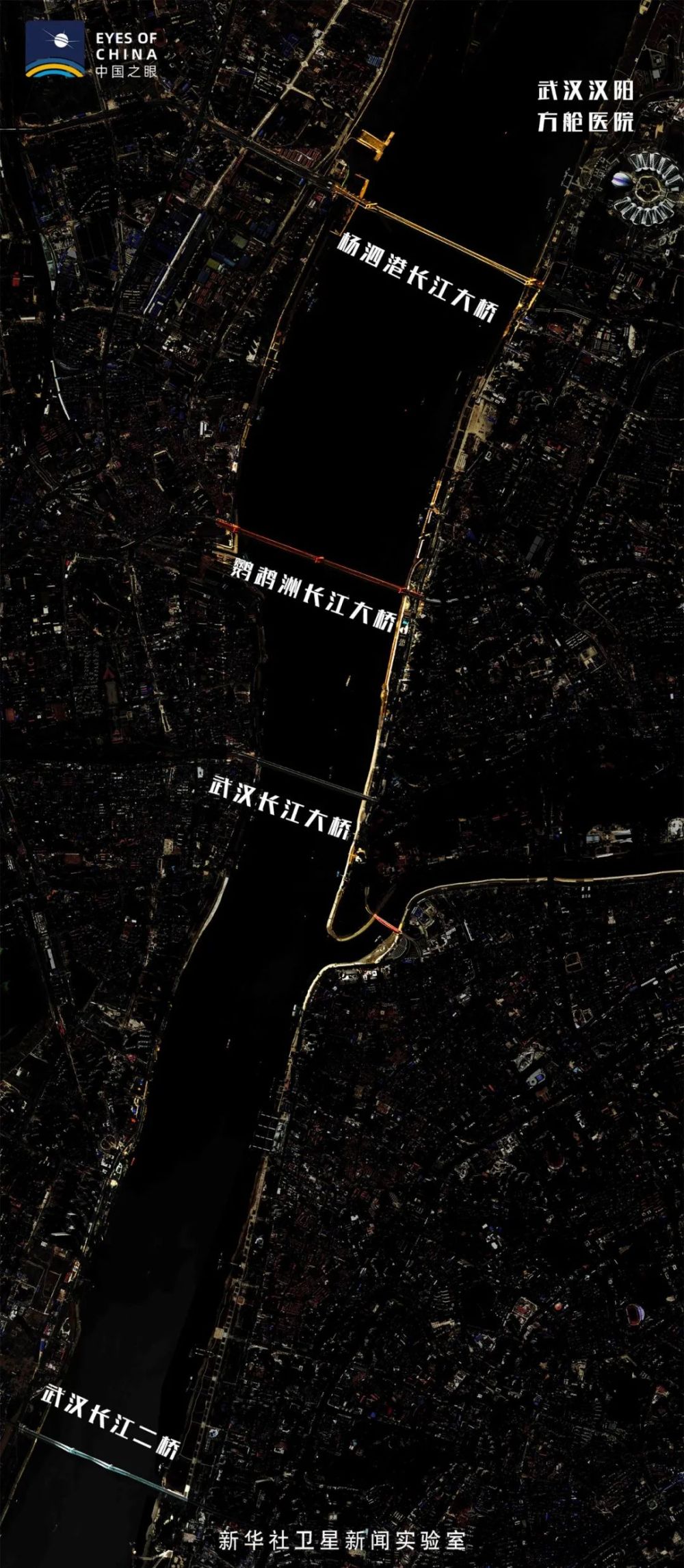 除了江漢區、硚口區、江岸區等核心城區的燈光一定程度變暗外,天河機場、武漢火車站、漢口火車站、武昌火車站等城市交通樞紐站依舊燈光閃耀,連接武漢三鎮的交通路網散發的路燈光串起了這座城市的運行脈絡,10天建成的火神山燈光由一片暗變成一片亮。