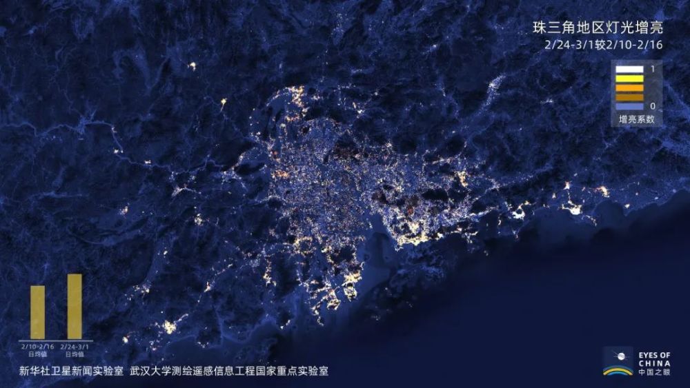 這是珠三角2月底較2月中旬的夜間燈光亮度增加情況,黃色越明亮,亮度增加越多。