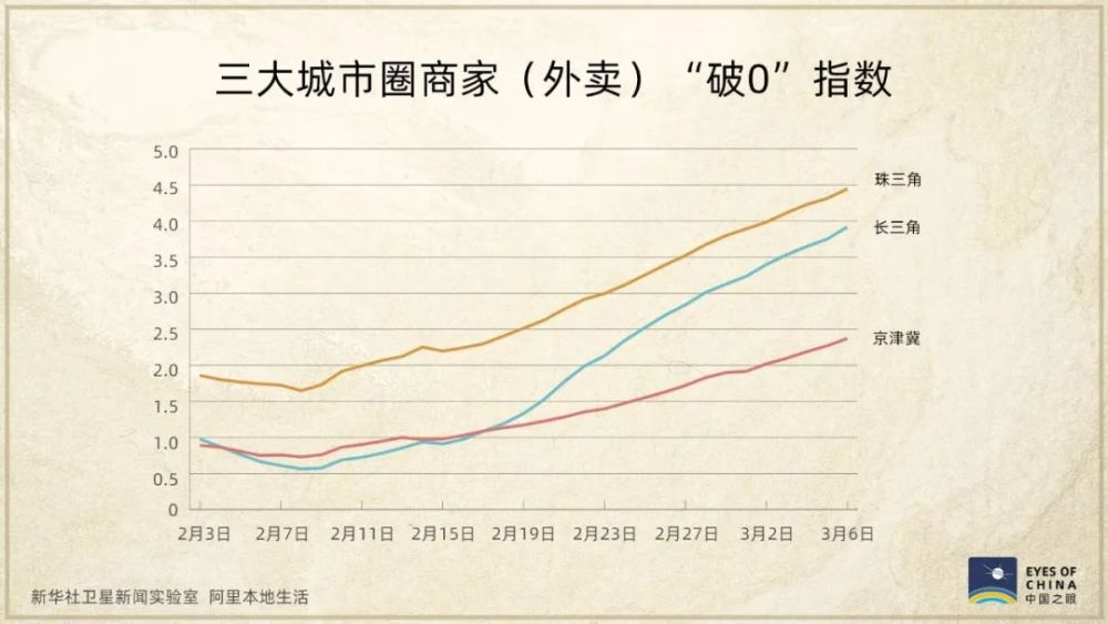 “破0”指數(shù),是根據(jù)商家恢復(fù)營(yíng)業(yè)獲得首筆收入、復(fù)工后的持續(xù)營(yíng)業(yè)時(shí)間等計(jì)算得出,這兩張圖呈現(xiàn)出,在三大城市圈,復(fù)工復(fù)產(chǎn)并獲得收入的商家不斷增多。