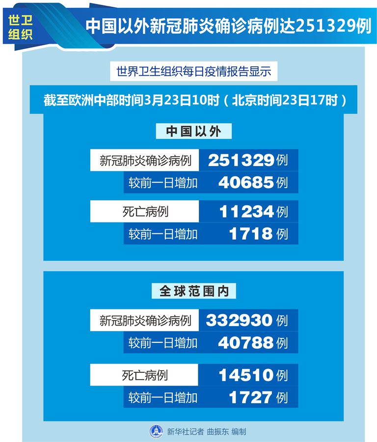 新華社日內(nèi)瓦3月23日電(記者劉曲)世界衛(wèi)生組織23日公布的最新數(shù)據(jù)顯示,中國(guó)以外新冠肺炎確診病例達(dá)到251329例。