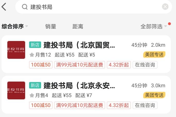 在外賣平臺上搜索可以發(fā)現(xiàn),不同書店標(biāo)注的起送價(jià)格不同,同時(shí)也會(huì)顯示店面與用戶的距離,以及需要的配送時(shí)間等信息。