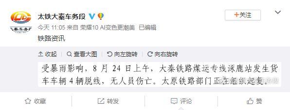 據大秦車務段官方微博消息,受暴雨影響,8月24日上午,大秦鐵路煤運專線涿鹿站發生貨車車輛4輛脫線,無人員傷亡,太原鐵路部門正在組織修復。