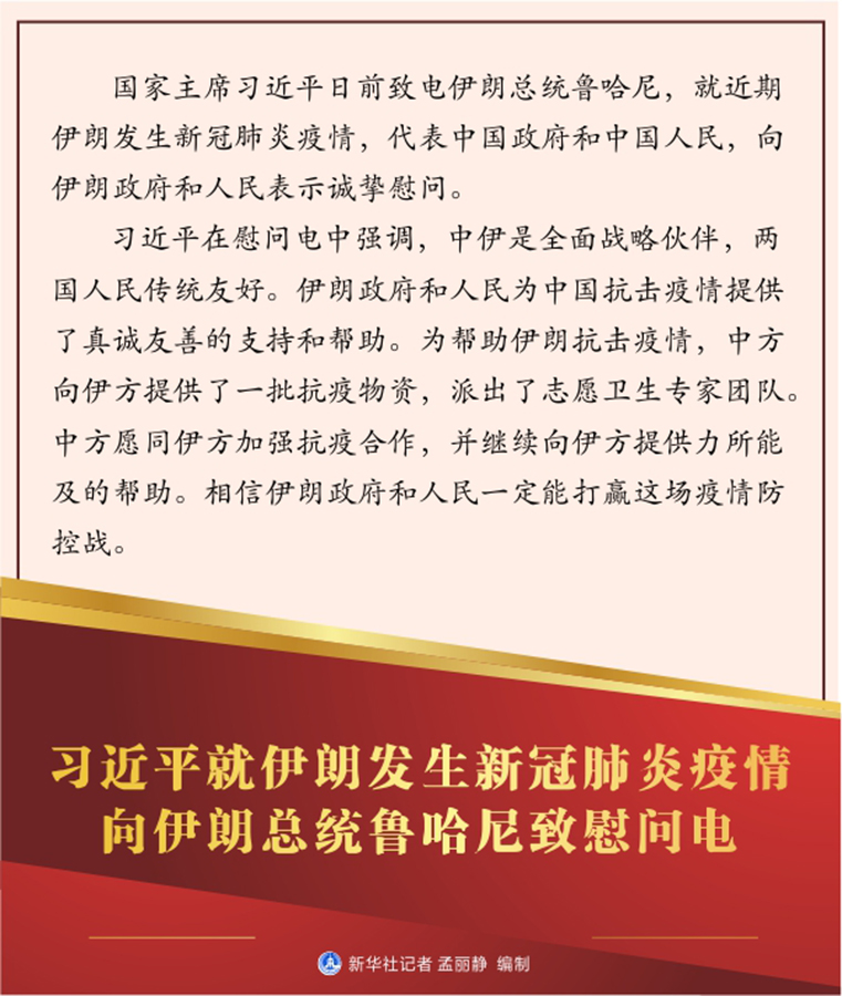 習(xí)近平在慰問(wèn)電中強(qiáng)調(diào),中伊是全面戰(zhàn)略伙伴,兩國(guó)人民傳統(tǒng)友好。伊朗政府和人民為中國(guó)抗擊疫情提供了真誠(chéng)友善的支持和幫助。為幫助伊朗抗擊疫情,中方向伊方提供了一批抗疫物資,派出了志愿衛(wèi)生專家團(tuán)隊(duì)。中方愿同伊方加強(qiáng)抗疫合作,并繼續(xù)向伊方提供力所能及的幫助。相信伊朗政府和人民一定能打贏這場(chǎng)疫情防控戰(zhàn)。