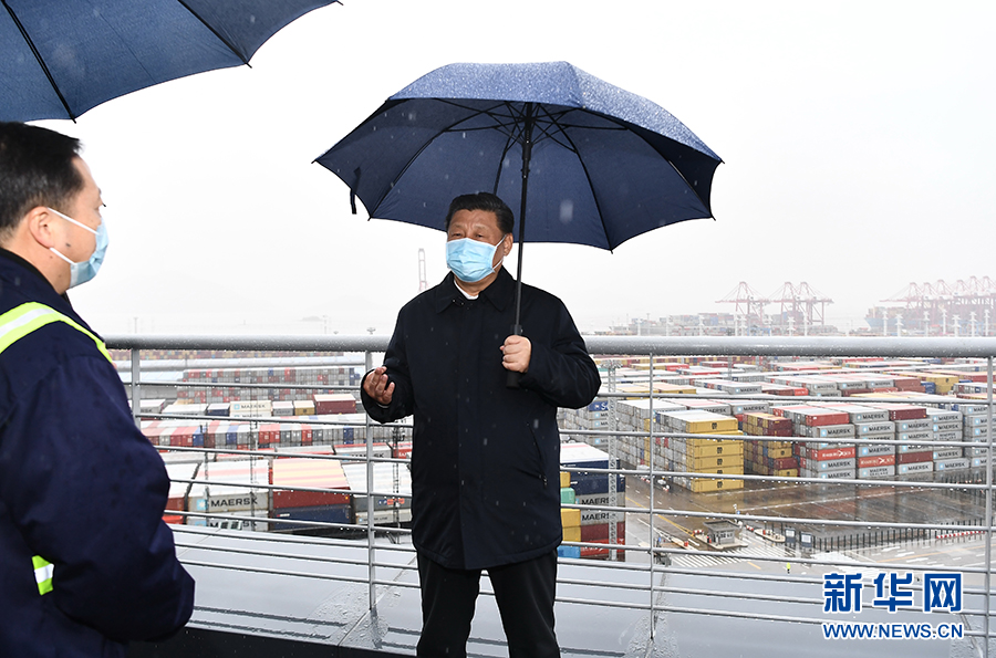 3月29日,中共中央總書記、國家主席、中央軍委主席習近平在浙江考察調研。這是習近平在寧波舟山港穿山港區碼頭了解港口復工復產情況。 新華社記者 燕雁 攝