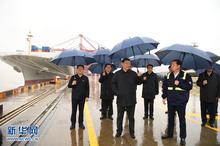 3月29日,中共中央總書記、國家主席、中央軍委主席習近平在浙江考察調研。這是習近平在寧波舟山港穿山港區碼頭了解港口復工復產情況。 新華社記者 申宏 攝