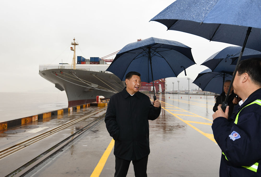 從新華社發(fā)出的現(xiàn)場照片看,總書記在寧波舟山港穿山港區(qū)碼頭上沒有佩戴口罩?!?