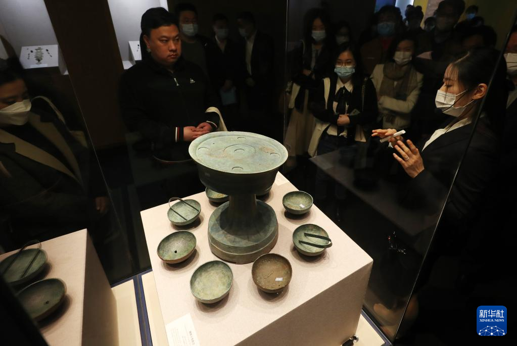 3月14日,参观者在战国铜俎豆夹组合展柜前驻足观看。