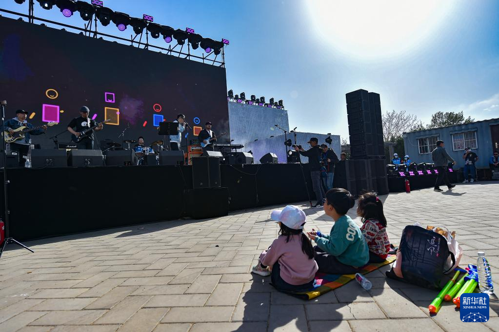 4月15日,小朋友在“2023下苑艺术生活季”活动现场观看乐队演出。
