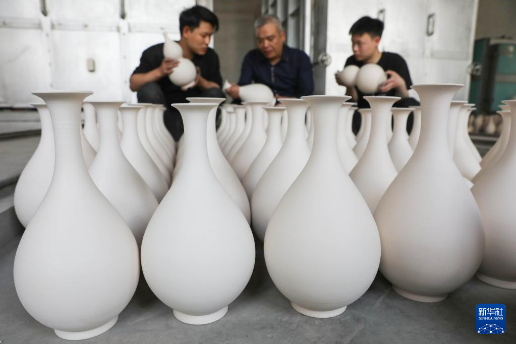 4月19日,在宝丰县一家汝瓷企业,汝瓷艺人王占稳(中)与同事一起挑选汝瓷素坯。