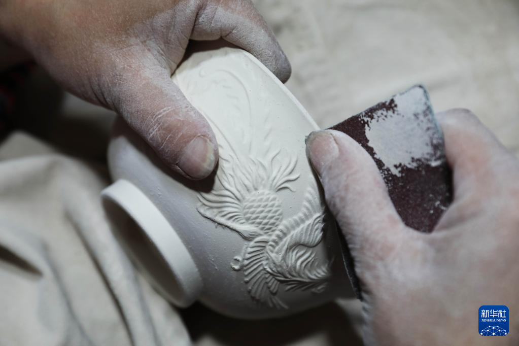 4月19日,在宝丰县一家汝瓷企业生产车间,汝瓷艺人在打磨素坯。