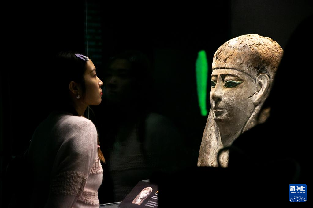 4月20日,观众在展览上观看木乃伊半身棺盖。