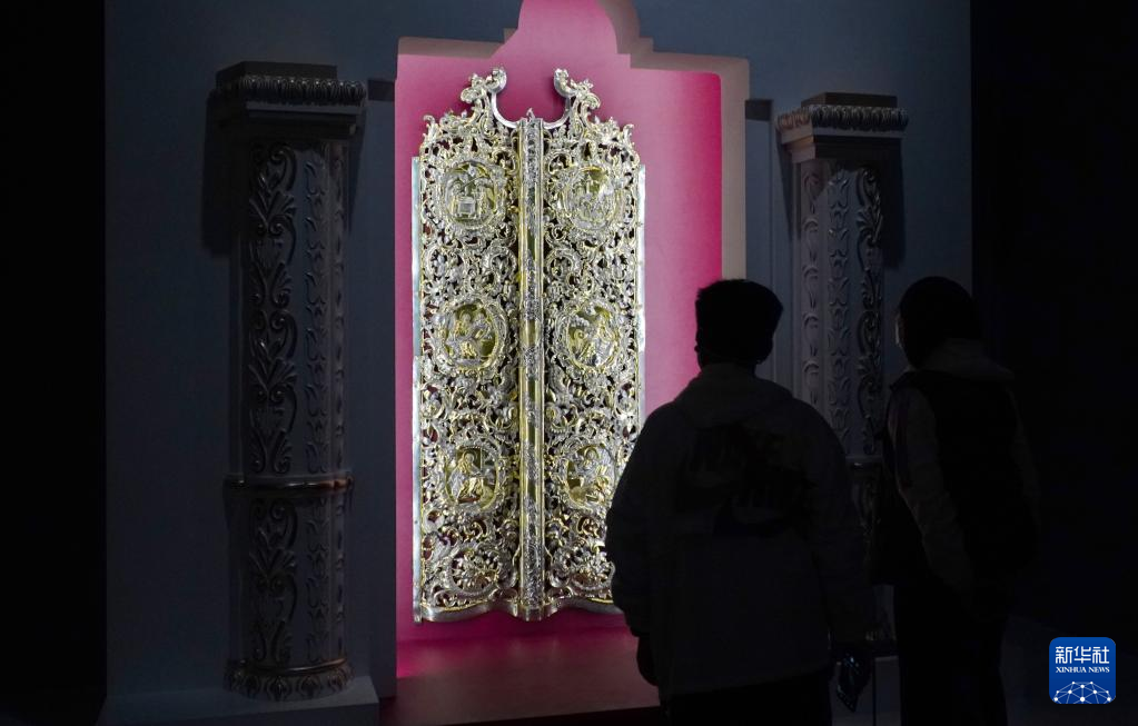 4月29日,在位于山东省济南市的山东博物馆,参观者在英国V&A博物馆藏吉尔伯特精品展上观看展品《镀金银装饰门板》。