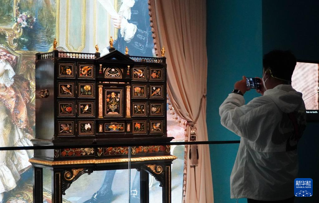 4月29日,在位于山东省济南市的山东博物馆,参观者在英国V&A博物馆藏吉尔伯特精品展上观看展品《花鸟图案柜》。