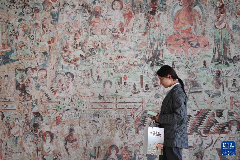 敦煌研究院文物数字化保护团队创意营销人员廖雪婷从一幅高保真复制壁画前走过(4月25日摄)。