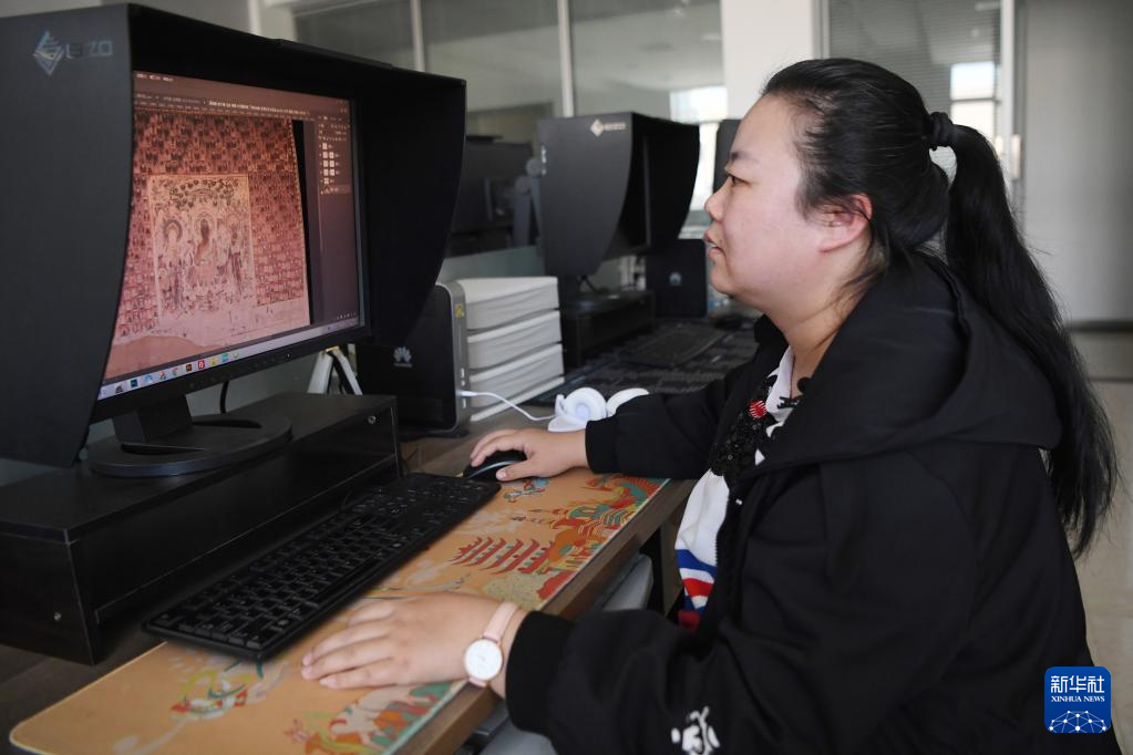 敦煌研究院文物数字化保护团队图像处理人员年海丽在拼接壁画图像(4月25日摄)。