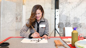 5月7日,在哈尔滨国际会展体育中心,观众在首届东北亚文化艺术创意设计博览会上留影。