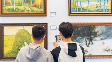 5月7日,在哈尔滨国际会展体育中心,观众在首届东北亚文化艺术创意设计博览会上参观拍照。