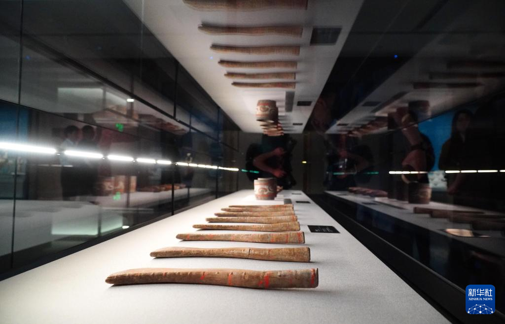 5月15日,在山东省青州博物馆新馆,大汶口文化彩陶壶正在进行展出。