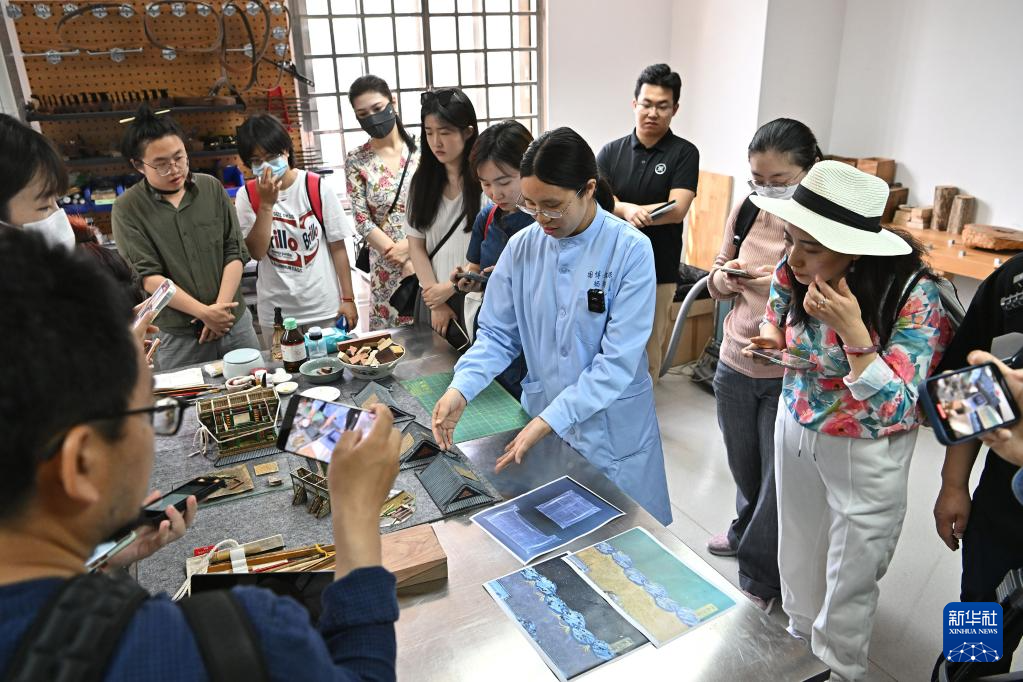 5月16日,国博文保院修复师杨琴(着蓝色工作服者)向媒体记者介绍通过科学检测手段分析研究圆明园同乐园建筑群样式雷烫样文物材质、构造等内容。