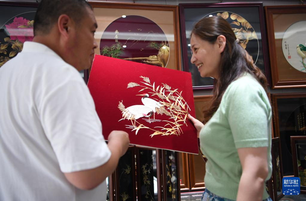 5月16日,谷穗(右)在门店里和丈夫葛磊讨论芦苇画。