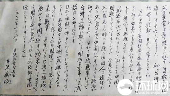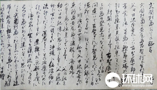 ????伊澤彌喜太長女伊澤真伎1901年2月生于黃尾嶼。她于1972年1月8日口述并請(qǐng)人代筆,用毛筆寫下一份《關(guān)于尖閣列島的證言》,其中披露了其父伊澤彌喜太1891年首次登島開發(fā)一事,并明確指出釣魚島“應(yīng)該歸還給它的故鄉(xiāng)——中國”。筆者現(xiàn)將部分證言的譯文公諸于眾:“我出生于尖閣列島(譯者注:釣魚島列島)的黃尾島古賀村。父親是井澤彌喜太(注:經(jīng)核實(shí)應(yīng)為伊澤彌喜太,屬于同音字記錄筆誤)。他曾任古賀辰四郎的業(yè)務(wù)主任,在該島經(jīng)營干制鰹魚工廠,也采集信天翁的羽毛以及貝殼等。現(xiàn)在報(bào)紙等報(bào)道稱古賀辰四郎是第一個(gè)發(fā)現(xiàn)該島嶼的人,這是彌天大謊,是絕對(duì)不可能的事情。因?yàn)橛忻魑挠涗浛梢宰C明,我父親于明治二十四年(1891年)航行至魚釣島(即釣魚島)、黃尾島,打撈海產(chǎn)品和采集信天翁的羽毛。……父親登島后曾對(duì)其進(jìn)行調(diào)查,期間在一個(gè)洞穴里發(fā)現(xiàn)兩具身著中國服裝的骸骨。現(xiàn)在看來,在父親登島之前可能已有中國人達(dá)到此處。父親和古賀相識(shí)是因?yàn)楣刨R當(dāng)時(shí)很有錢,他曾主動(dòng)向父親提出:‘你在沖繩經(jīng)營事業(yè)需要資金,我們一起合作怎么樣。’因?yàn)槭枪刨R出資,所以名義上是古賀經(jīng)營,但一切事務(wù)實(shí)際上都是由我父親全權(quán)負(fù)責(zé)的。古賀也曾說過,他允許我父親在那里自主隨意地經(jīng)營。