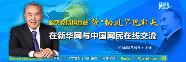 ????新華網(wǎng)上海5月20日電 哈薩克斯坦總統(tǒng)納扎爾巴耶夫20日接受新華網(wǎng)獨(dú)家訪談與中國網(wǎng)民在線交流,回答中國網(wǎng)民的問題。