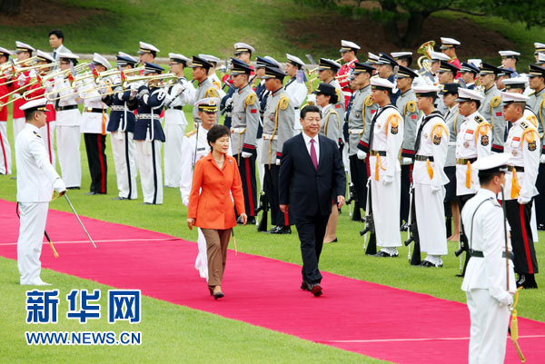 ??? 7月3日,國家主席習(xí)近平在首爾同韓國總統(tǒng)樸槿惠舉行會談。會談前,樸槿惠在青瓦臺總統(tǒng)府為習(xí)近平舉行隆重歡迎儀式。 新華社記者姚大偉攝