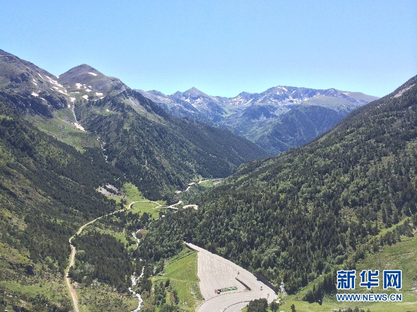 ????安道爾境內連綿起伏的山脈和山間的公路。雖然是夏季,依然可以看到還有一些積雪。(周喆 攝)