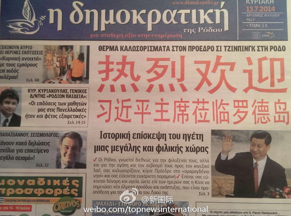 ????新華網(wǎng)北京7月14日電 據(jù)新華社“新國際”微博報(bào)道,希臘羅德島報(bào)紙《民主報(bào)》13日在頭版發(fā)表題為《一個(gè)偉大友好國家領(lǐng)導(dǎo)人的歷史性訪問》文章,并用中文紅色大字體寫著“熱烈歡迎習(xí)近平主席蒞臨羅德島”。文章說,熱情好客的羅德島人民祝愿習(xí)近平主席身體健康,祝愿中國在習(xí)主席領(lǐng)導(dǎo)下取得跨越式發(fā)展,祝愿中國繁榮昌盛。