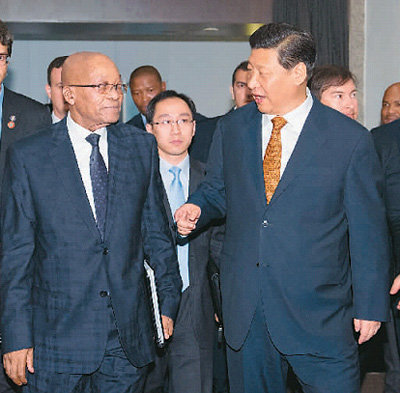習(xí)近平表示,當(dāng)前,中南關(guān)系正面臨重要發(fā)展機遇期,合作潛力巨大,我們應(yīng)該乘勢而上,努力推動中南關(guān)系再上新臺階。我歡迎祖馬總統(tǒng)下半年訪華,共同制定未來合作規(guī)劃。雙方要積極開展能源、礦業(yè)、農(nóng)業(yè)、裝備制造、基礎(chǔ)設(shè)施建設(shè)、鐵路機車、核電等領(lǐng)域合作,中方愿繼續(xù)配合南非辦好2014年中國南非年活動。