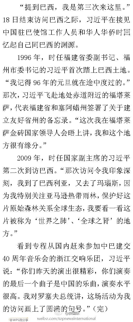 新華網(wǎng)北京7月19日電? 據(jù)新華社“新國際”微博報道,“提到巴西,我是第三次來這里。”18日結束訪問巴西之際,習近平在接見中國駐巴使館工作人員和華人華僑時回憶起自己同巴西的淵源。