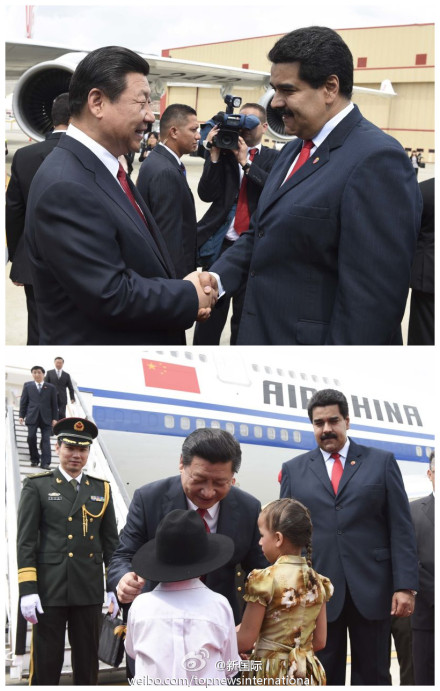 ????新華網(wǎng)北京7月21日電 據(jù)新華社“新國際”微博報道,經(jīng)過近7小時飛行,習近平主席當?shù)貢r間20日下午飛抵加拉加斯。專機進入委領(lǐng)空后,委空軍2架蘇-30戰(zhàn)機升空護航。馬杜羅總統(tǒng)親自到機場迎接。隨后,歡迎儀式在機場隆重舉行,習近平在馬杜羅陪同下檢閱儀仗隊。