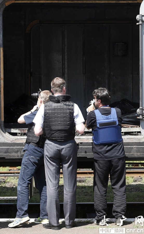 當地時間2014年7月20日,烏克蘭頓涅茨克Torez,馬航墜機遇難乘客遺體被裝上列車冷藏車廂將被運走。載有部分遺體的火車從距空難現場不遠的烏克蘭托列茲市出發,前往頓涅茨克市。火車離站前,身處空難現場的歐洲安全與合作組織(歐安組織)代表檢查了運載遺體的5節冷藏車廂。
