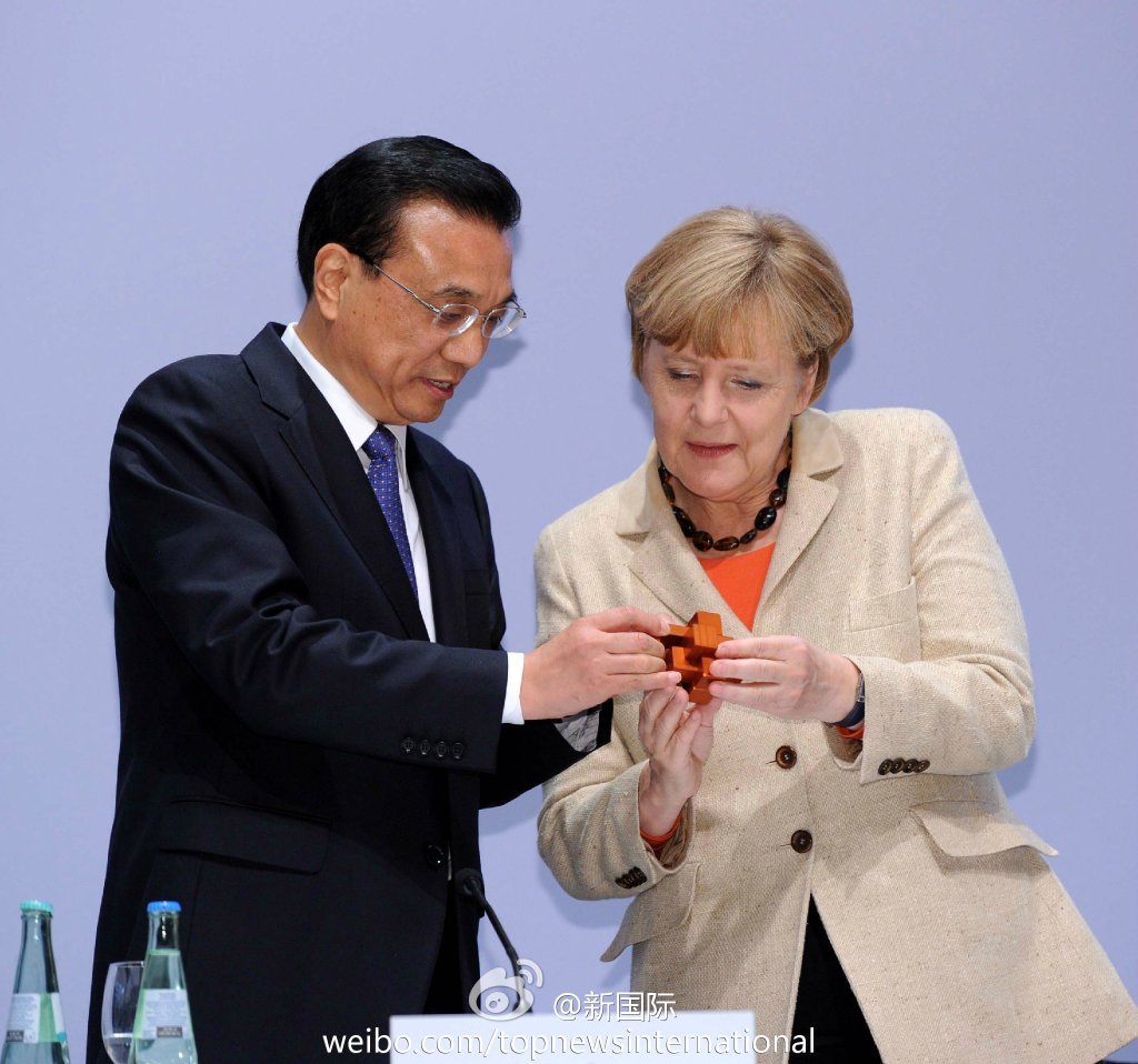 ????新華網北京10月11日電? 據新華社“新國際”微博報道,10日的中德經濟技術論壇上,李克強總理將一精巧的魯班鎖送給默克爾。他說,這是天津中德職業技術學院師生共同創作的作品,希望我送給默克爾總理。解開魯班鎖是解決一道難題,相信中德之間的合作能不斷創新,共同破解世界性難題,開啟美好的未來。