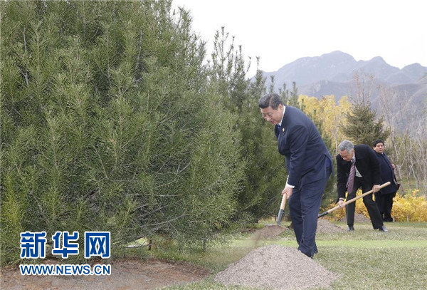 出席APEC會議的領導人或代表一起來到雁棲島上的夏園。習近平走到一棵白皮松樹前,脫去外套,拿起鐵鍬,彎腰培土,并拎起木桶為樹澆水。其他APEC經濟體領導人或代表培土、澆水、整理樹冠……夏園里的這片松林為雁棲島增添了一抹亮麗的綠色。