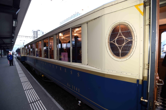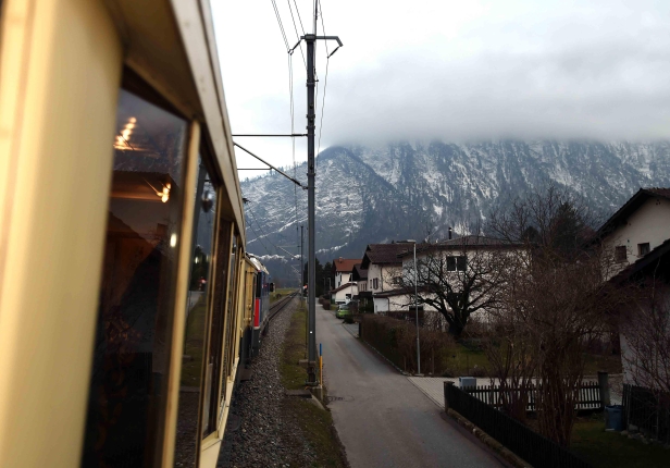 前往達沃斯通常乘坐的紅色窄軌小火車很有特色??藦娍偫泶舜纬俗膶A惺侨鸱借F路公司專門用于租借的,充當過不少國家領導人的專列,顏色不同于普通小火車的紅色,而是藍白配色的。